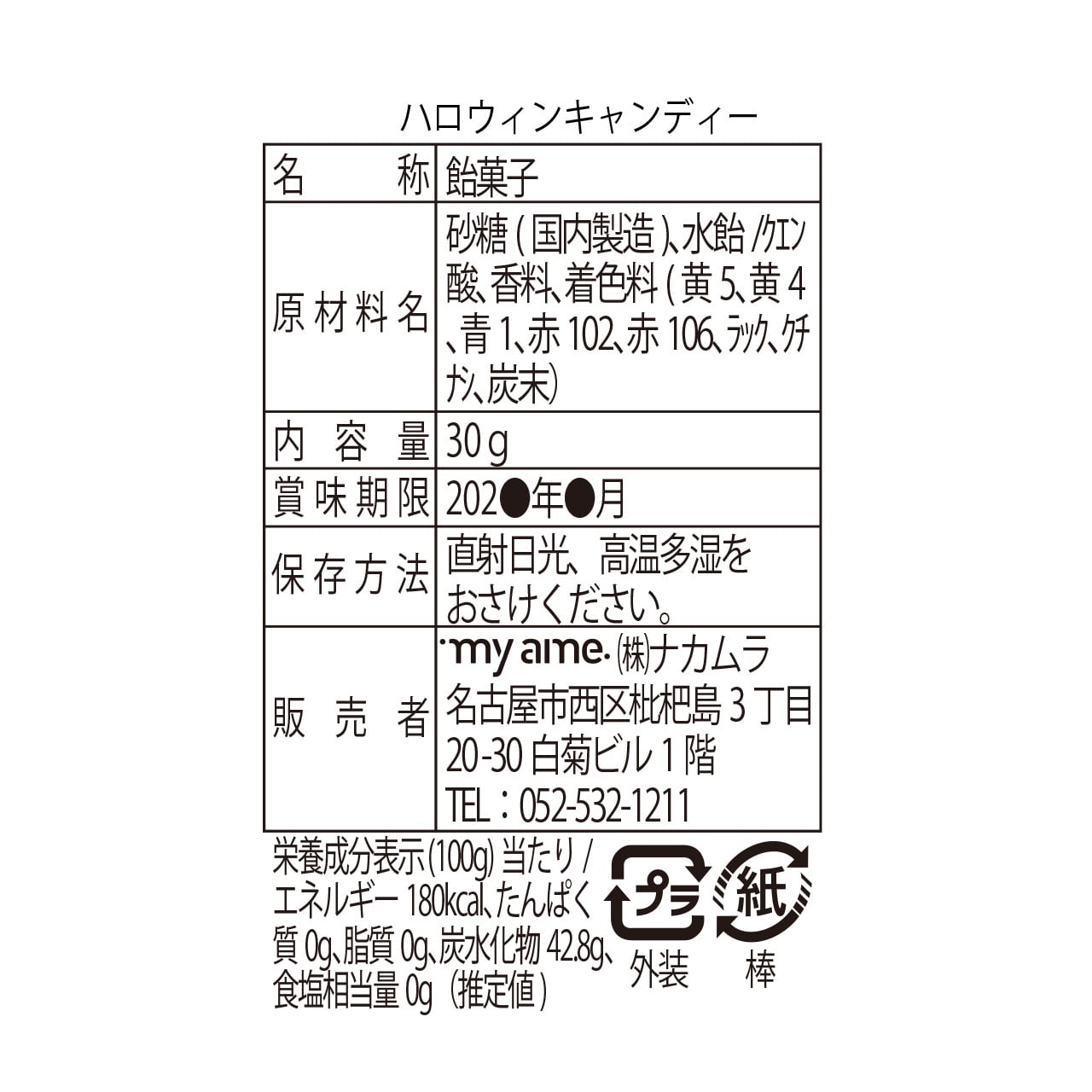 【原材料】砂糖(国内製造)、水飴/クエン酸、香料、着色料(黄5、黄4、青1、赤102、赤106、ラック、クチナシ、炭末)
